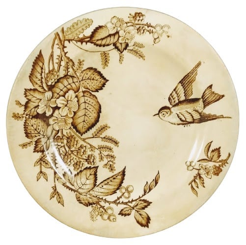 Plate, 7.25 inches diameter. Brown transfer. This pattern features a bird swooping over a berry briar laden with berries and blossoms.