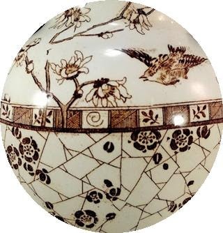 Pitcher, 6 x 5.5 inches. Brown transfer. Maker is F. J. Emery. There are birds flying on both sides of the pitcher, with flowering branches filling the space. A similar flower appears inside the lip of the jug, and there is a band of design on the handle. Another band encircles the wide part of the jug and features the prunus and cracked ice pattern.