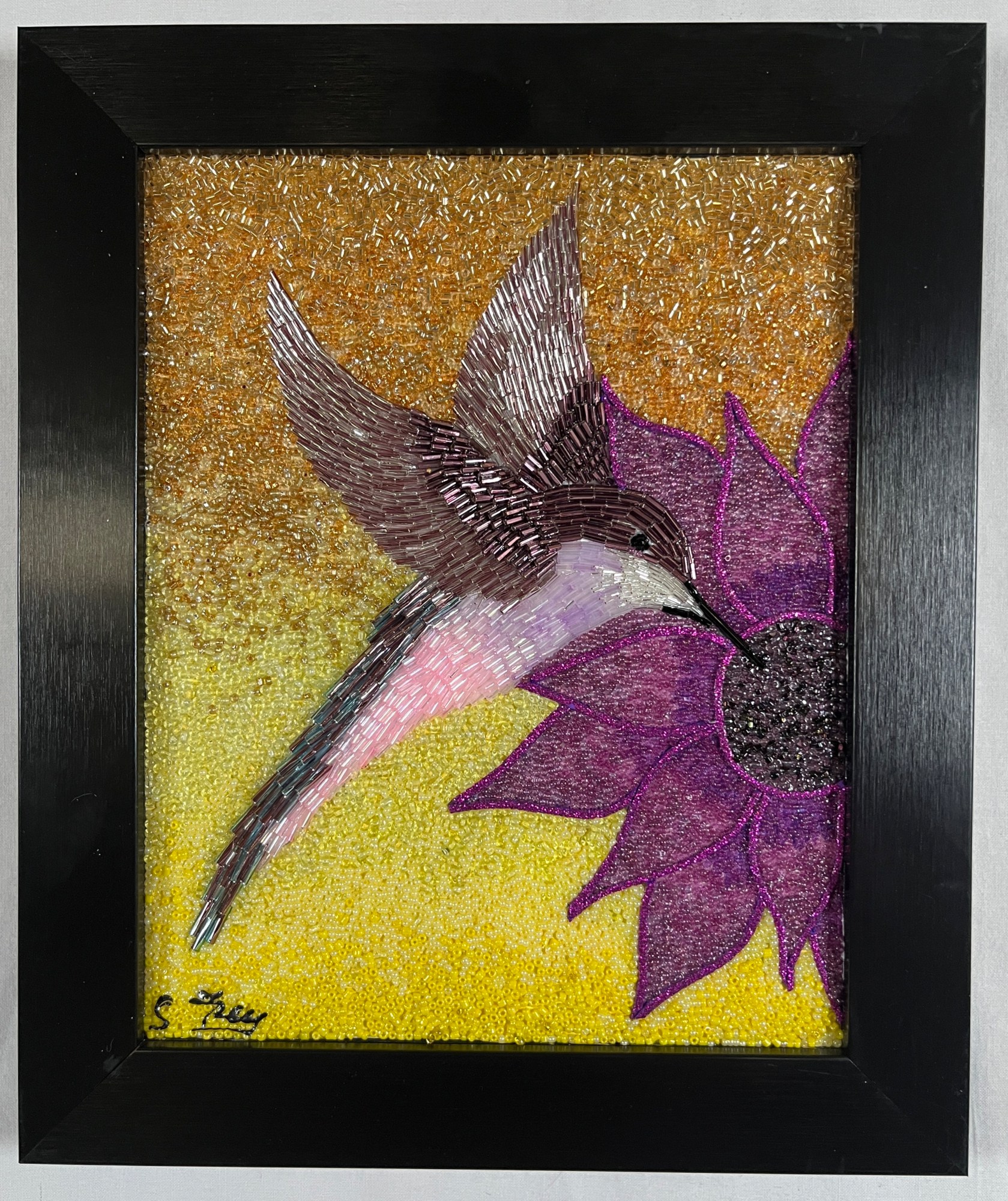 Hummingbird fluttering around a beautiful purple flower, made of bugle and seed beads. Image = =8x10