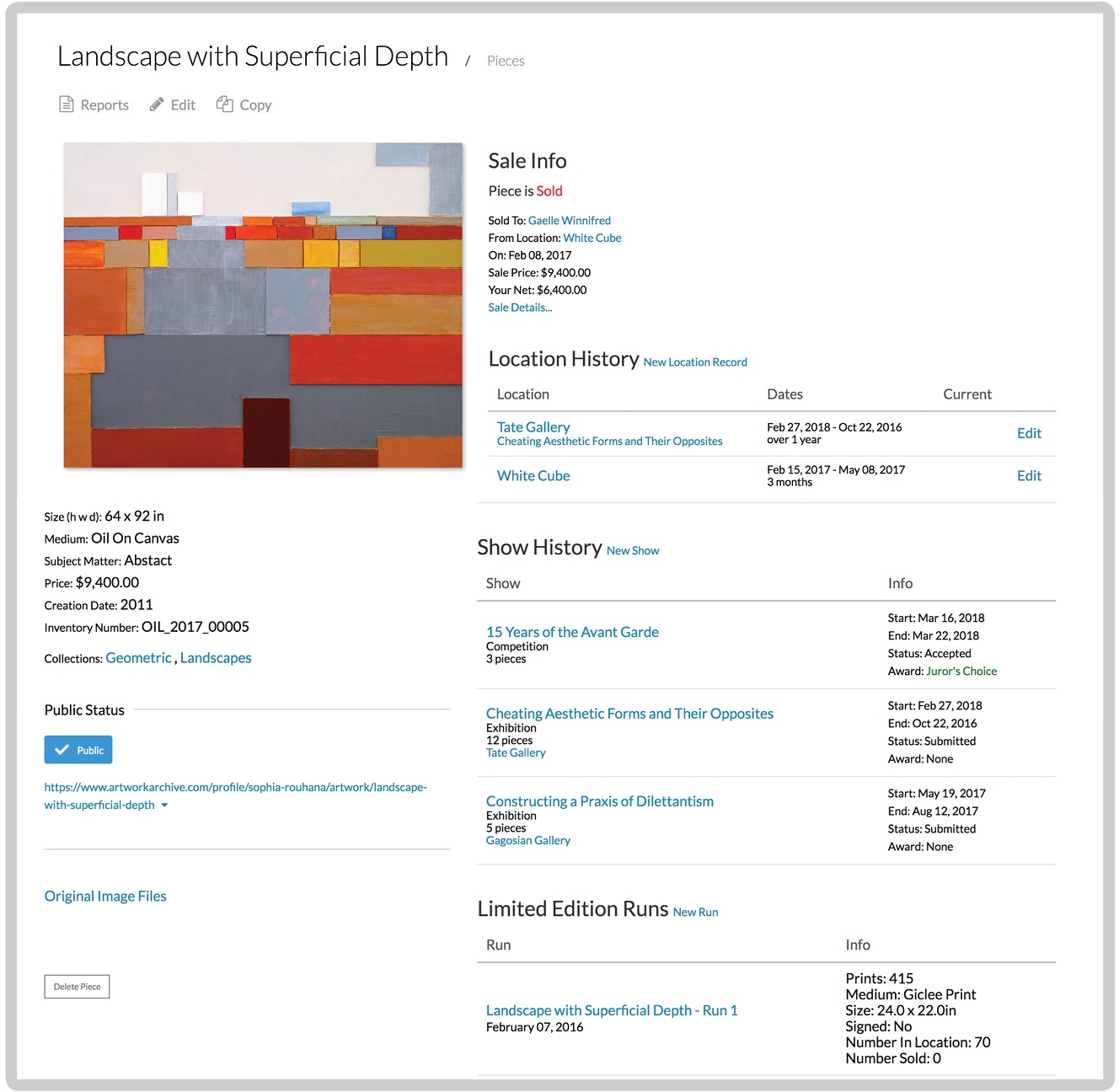 Sort work by date, price, size, creation date, title and more.Quickly see what works have sold and what’s in your inventory.Stored in the Cloud so that everything is accessible anywhere, anytime, on any device.