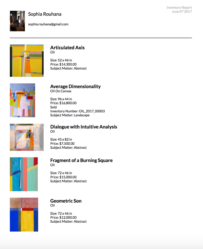 As the years go by and the works amass, it can be easy to forget which painting goes with what title. It’s also nice to have beautiful, high-quality images of your work to send to interested art collectors, buyers, and galleries using the Artwork Archive inventory report or portfolio page feature.
