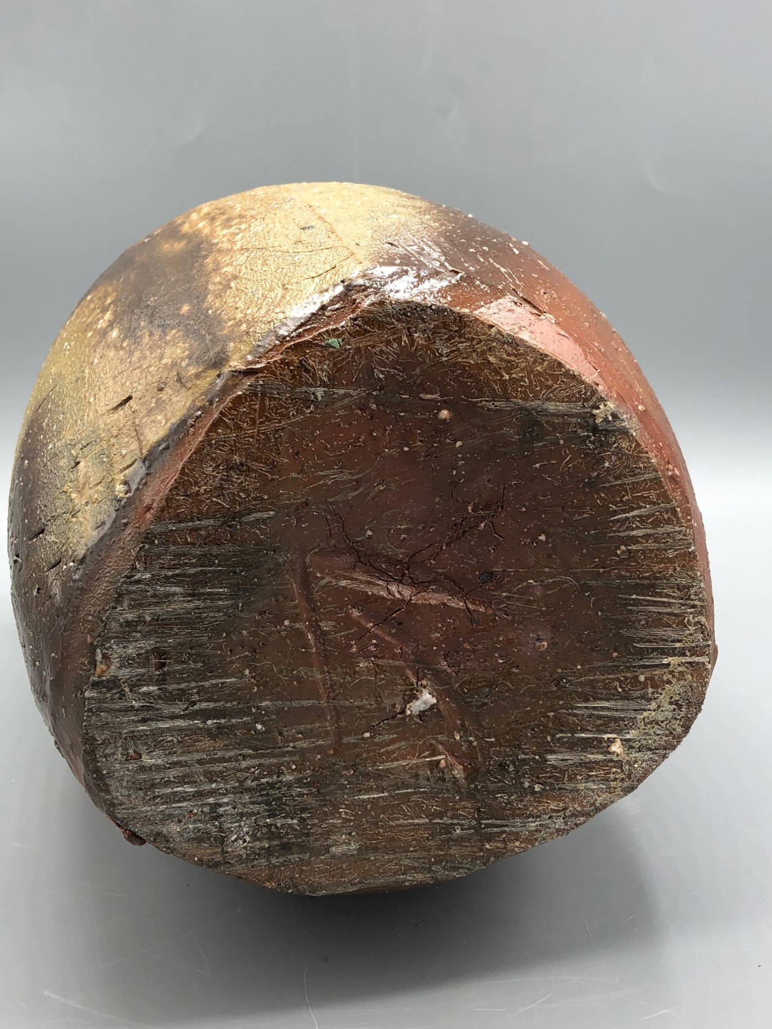 Ikebana bucket vase. Purchased at a NJ auction as part of a three-piece set. One other ikebana bucket vase, and a lidded vessel. Identity of the artist was not known to the auction house; the piece was subsequently ID'd by an expert in Japanese ceramics. Bizen-ware.