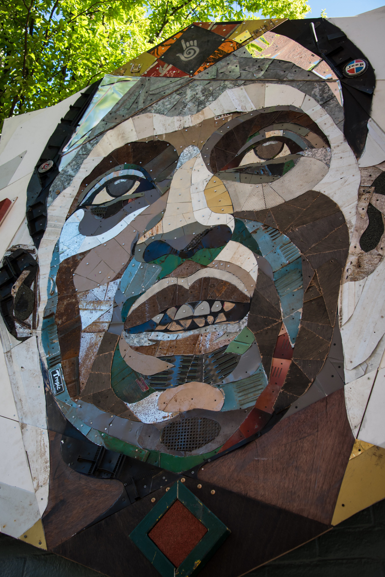 20×21 EUG Mural Project’s first track-inspired artwork, Small’s 8-by-8-foot portrait of African-American track & field legend Jesse Owens is a masterpiece of found pieces. Using pieces of recycled materials he found from Bring Recycling as well as wood from the recently dismantled Hayward Field, Small’s artwork is a three-dimensional portrait unlike any other.