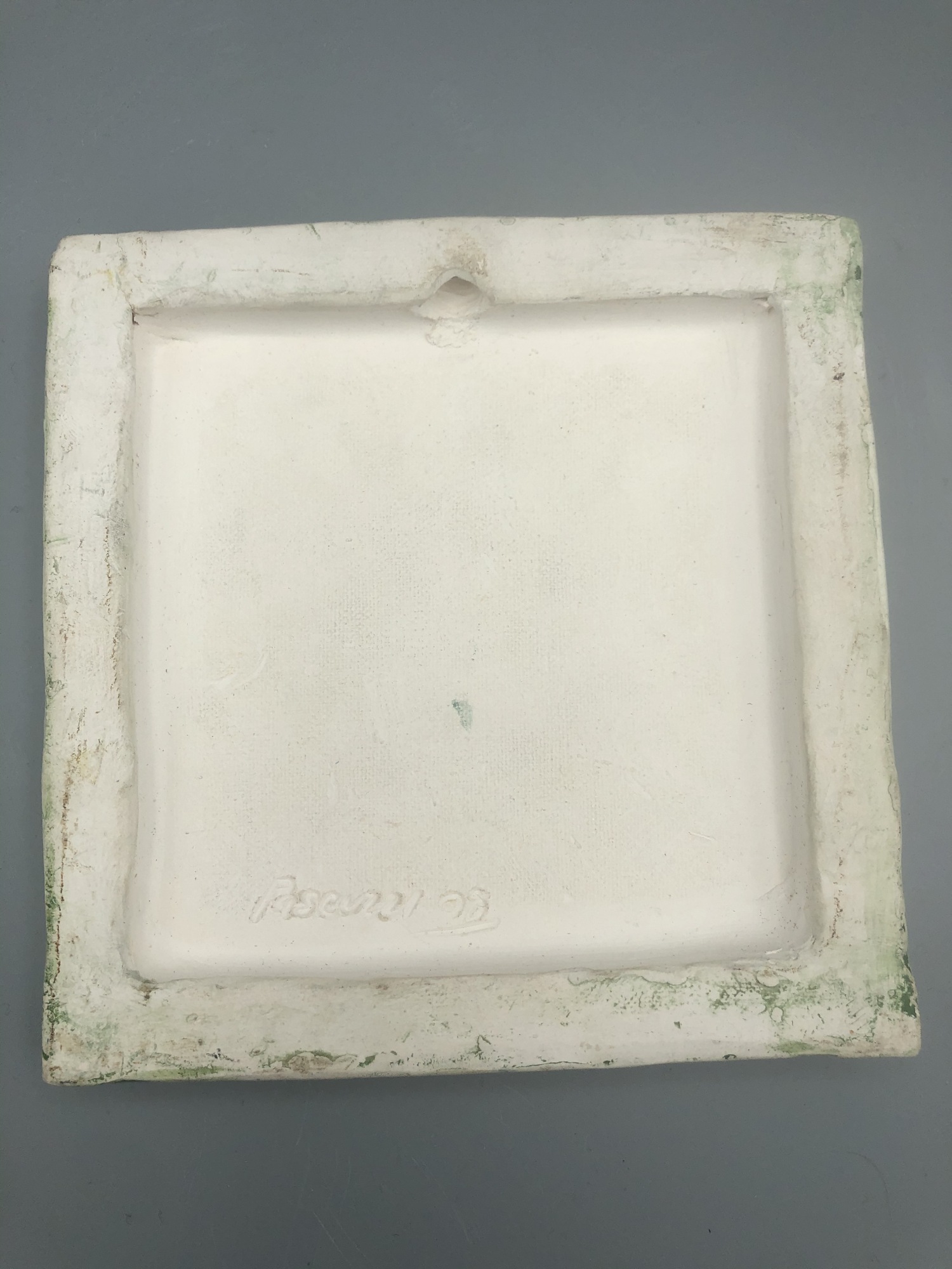 This ceramic wall tile is designed to hang on a hook or nail. The back of the tile has a lip on the perimeter with a notch on the top for hanging. I use vintage ceramic decals for these pieces.