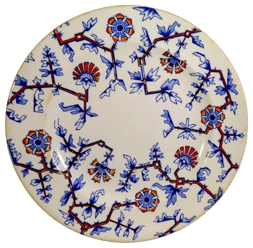 Plate, 10 inches diameter. Blue transfer with polychrome clobbering. Printed and impressed maker's marks for George Jones & Sons. The registry diamond dates the registration of this pattern to 7 June 1878. The pattern name "Plevna" could be a reference to the Siege of Plevna in Bulgaria which had taken place the year before this pattern was registered as part of the Russo-Turkish War (1877-1878). Quite incongruently, this pattern features a series of highly stylized and geometric flowers and leaves on stems radiating inward from the rim of the plate. This pattern was given the patent no. 322309 and was used on toilet ware. It has been seen in two different multicolor versions.