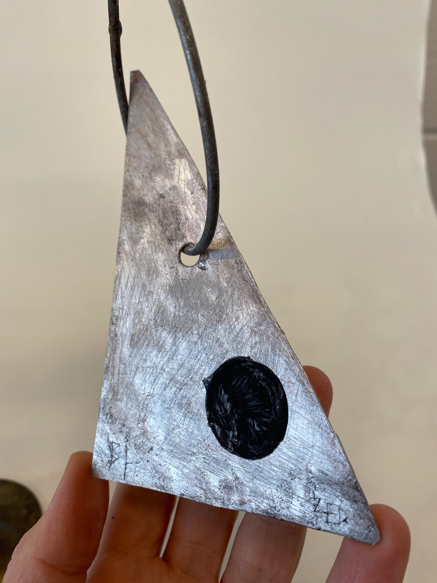 Abstract sculpture in metal featuring a Z form by self taught Scottish artist Bill Low (1898-1980). This constructivist sculpture features white painted sheet metal fins and a red accent. Titled 'Zed' on lower sheet metal and signed 'Bill Low' on underside of base.